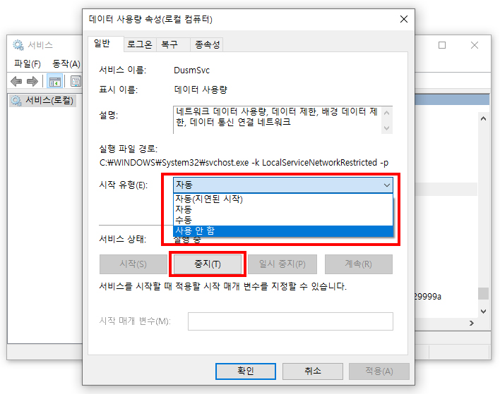 4. 데이터 사용량 속성(로컬 컴퓨터) 화면에서 [시작 유형] 우측 메뉴를 클릭하여 [사용 안 함]을 선택합니다.