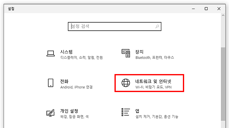 2. Windows 설정 화면에서 지구본 모양의 [네트워크 및 인터넷] 메뉴를 클릭합니다.